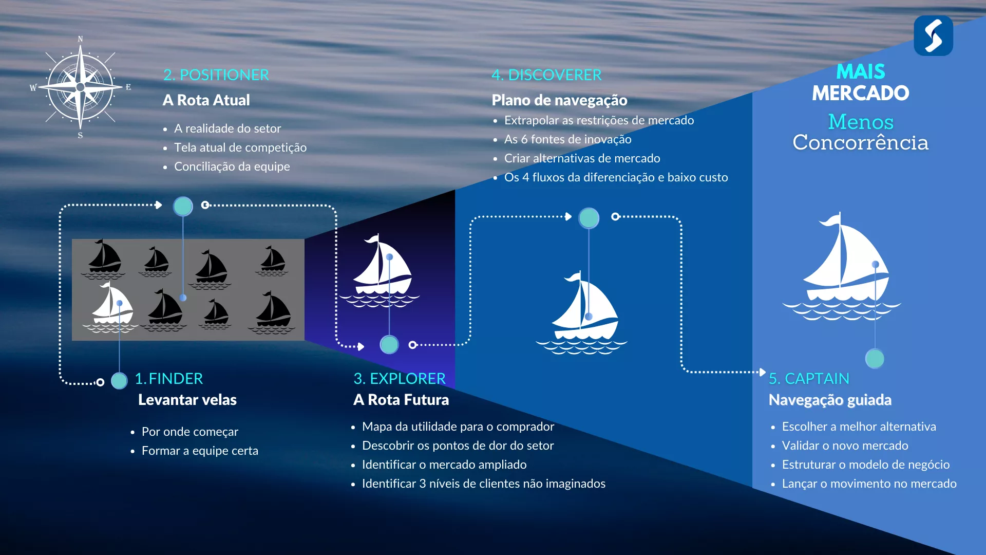 Nesta fase, os buscadores de oceano azul, serão orientados POR ONDE COMEÇAR a busca escolhendo o produto ou serviço mais viável e preparar a sua empresa para a transformação.