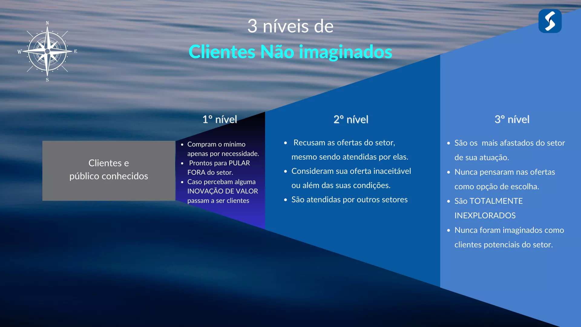 Nesta fase, faremos o MAPA DE UTILIDADE PARA O COMPRADOR, que ajudará a descobrir os PONTOS DE DOR DOS CLIENTES. Vamos romper a percepção limitada de quem são os clientes do setor, e passaremos a IDENTIFICAR O MERCADO AMPLIADO. Aplicaremos o modelo analítico de 3 NÍVEIS DE CLIENTES NÃO IMAGINADOS, para identificar o cenário de demanda total que está além da compreensão atual do setor. Os clientes invisíveis para a empresa, tornam-se visíveis, liberando a demanda represada.